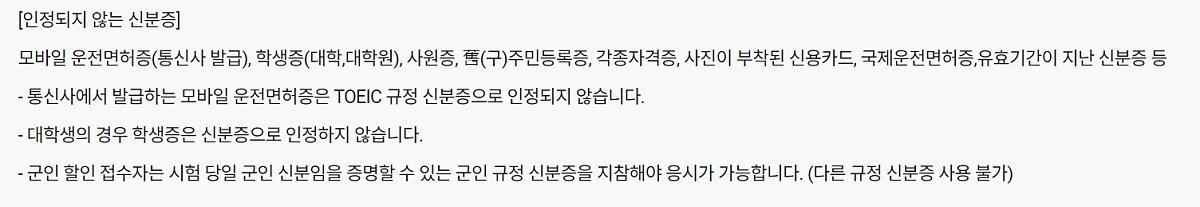 ★ 토익시험시, 인정되지 않는 신분증은 모바일 운전면허증, 학생증, 사원증, 각종자격증, 사진이 부착된 신용카드, 국제운전면허증, 유효기간이 지난 신분증 등이 있습니다.
