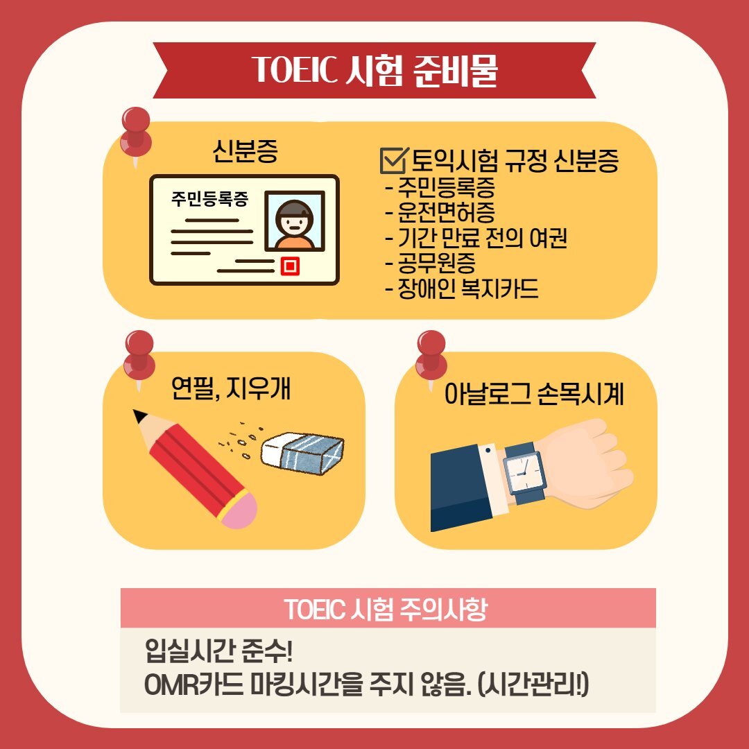 * 규정 신분증 미지참시, 절대 토익시험을 응시할 수 없으므로, 꼭! 규정신분증을 챙겨주세요!